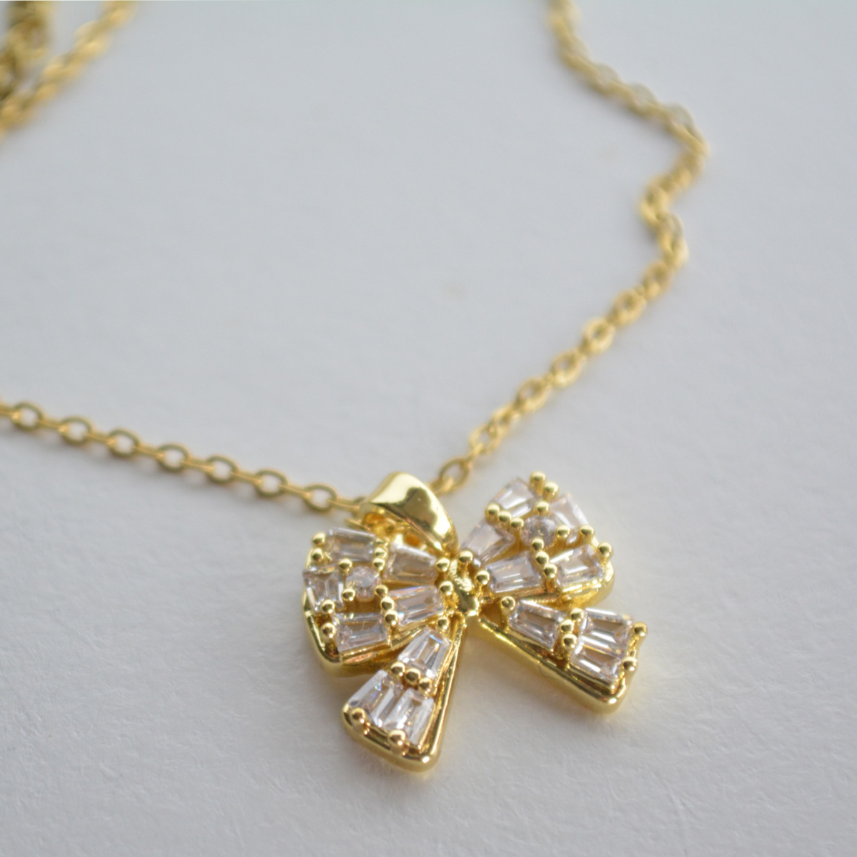Un toque de elegancia sutil para cualquier ocasión. El Collar Encanto destaca por su delicado dije en forma de lazo con incrustaciones brillantes que reflejan la luz con cada movimiento.