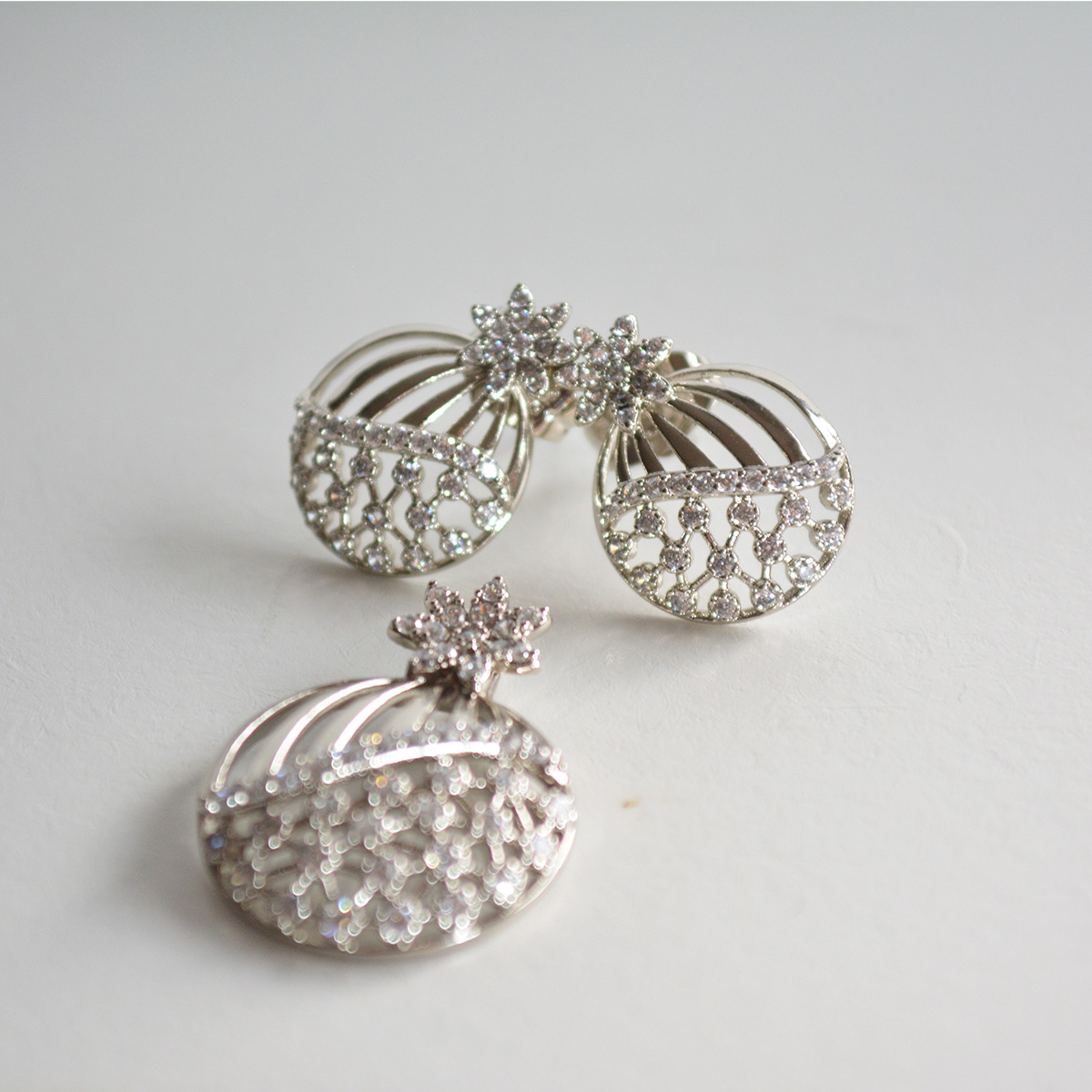 El Conjunto Holiday incluye aretes y collar con un diseño inspirado en las esferas festivas. Su acabado plateado y circonias lo hacen ideal para destacar con un toque elegante.